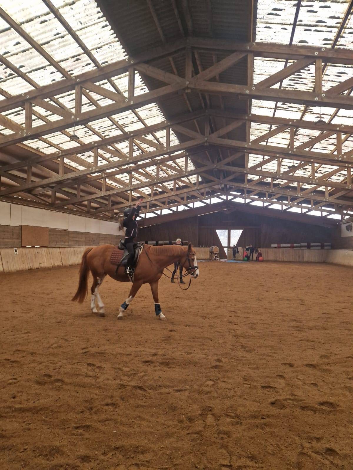 Ziemlich sportlich ging es an unserem ersten Pferdesonntag im neuen Schuljahr los: in großer Runde trafen wir uns am Sonntagnachmittag in der Reithalle, ganz bunt gemischt von den jüngsten Voltis bis zu unseren jungen Erwachsenen Reiterinnen. Wir begannen mit Konditionstraining, den Voltis gut bekannt als „Lauf-ABC“: im Hopserlauf, Seitgalopp, mit Anfersen und Knien hoch und vielen weiteren Schritten ging es zu Musik durch die Reithalle. Gut aufgewärmt ging es weiter mit Krafttraining, was uns alle ordentlich zum Schwitzen brachte. Im Fokus standen Körperspannung, Rücken, Bauch und Beine. Anschließend trainierten wir unsere Koordination und Balance. Sowohl fürs Reiten als auch fürs Voltigieren ist es unerlässlich, dass wir verschiedene Körperteile unabhängig voneinander einsetzen können. Ein Beispiel sind die Hände, die ruhig getragen werden sollen, während die Schenkel treiben… Die Übungen, wie mit der einen Hand eine Acht in die Luft zu malen und mit der anderen Hand einen Kreis, waren nicht so einfach wie es klingt – und so manche Acht bekam plötzlich drei Kreise. Zum Schluss dehnten wir uns noch vom Nacken bis zu den Füßen.
