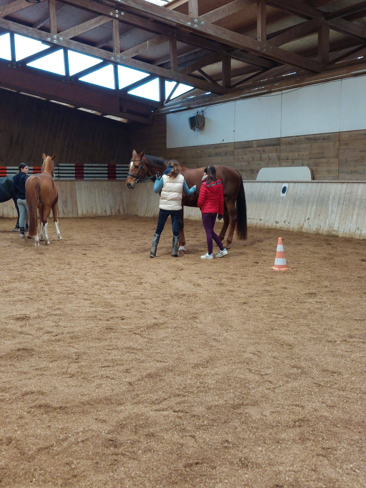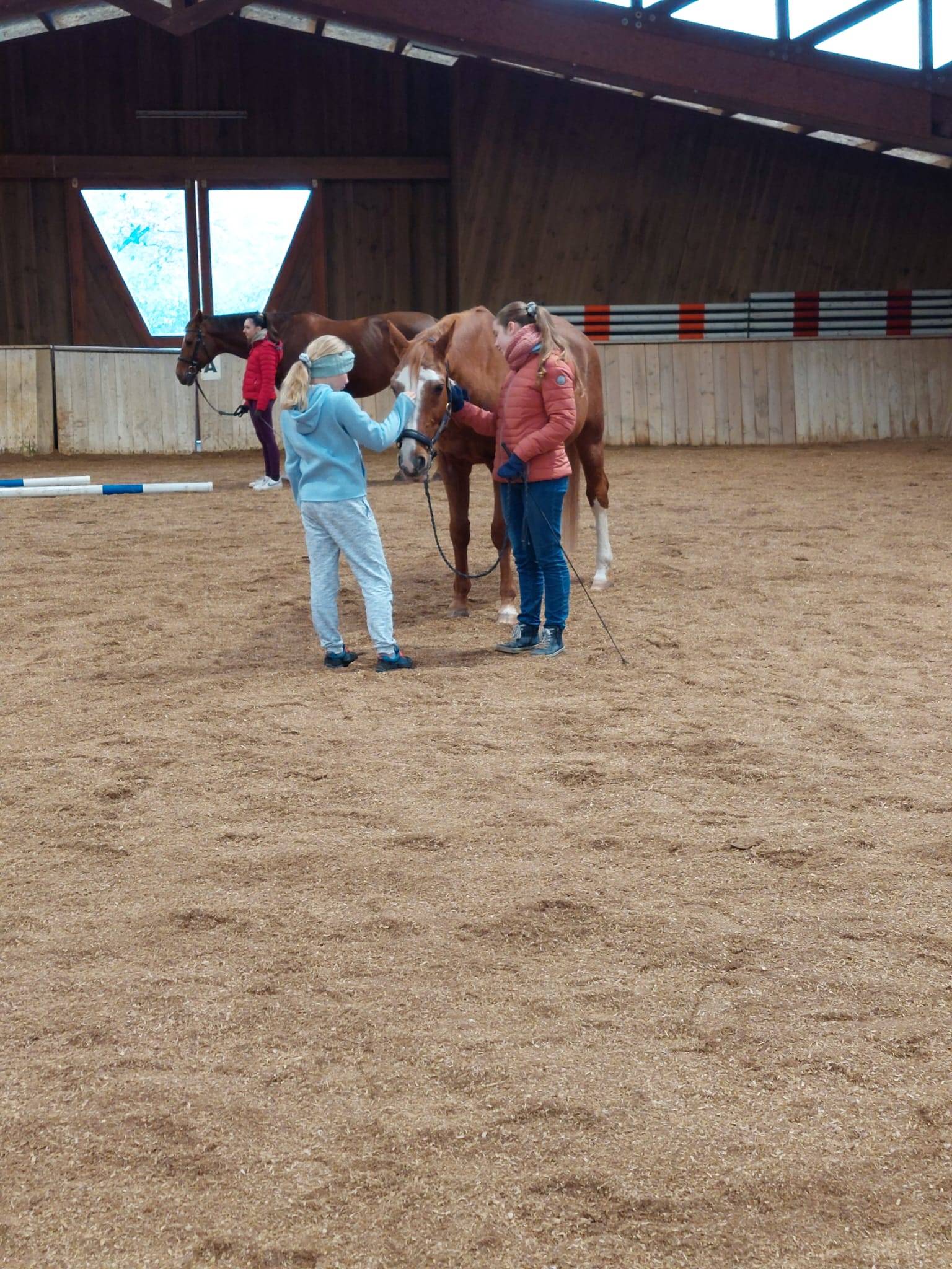 Danach gingen wir, diesmal mit sechs Pferden, wieder in die Halle. Während jeweils zu zweit die Pferde warm geführt wurden, bauten wir verschiedene Stationen zur Gymnastizierung der Pferde auf. Auch für sie stand heute Koordinationstraining und abschließend Dehnen auf dem Programm. Das Durchqueren eines Slaloms aus Pylonen, das Biegen auf engen Volten durch Stangen hindurch, vorwärts und rückwärts durch ein Stangen-L sowie durch eine Gasse mit einem Cavaletti in der Mitte verlangt von den Pferden viel Körperbeherrschung ab. Gleichzeitig konnten wir daran arbeiten, klare Signale und Hilfen vom Boden aus zu geben, damit die Pferde uns so gut verstehen, dass sie alle Aufgaben problemlos meistern können. Als Belohnung gab es dann noch „Möhrchen-Gymnastik“: um ein Stück Karotte oder Birne zu bekommen, sollten sich die Pferde nach vorne, oben, rechts und links und zwischen den Vorderbeinen hindurch strecken. Dies alles ist einerseits eine tolle Abwechslung und gute Beziehungsarbeit, hilft aber auch für mehr Lockerheit in den Bewegungen sowie stabilere Stellung, Längsbiegung und Geraderichtung. Es war der erste Pferdesonntag mit unseren Neuzugängen im Stall: Nika, Libby und Samson hatten sichtlich Freude dabei, neben Doreen, Cormet und Sandro dabei zu sein.