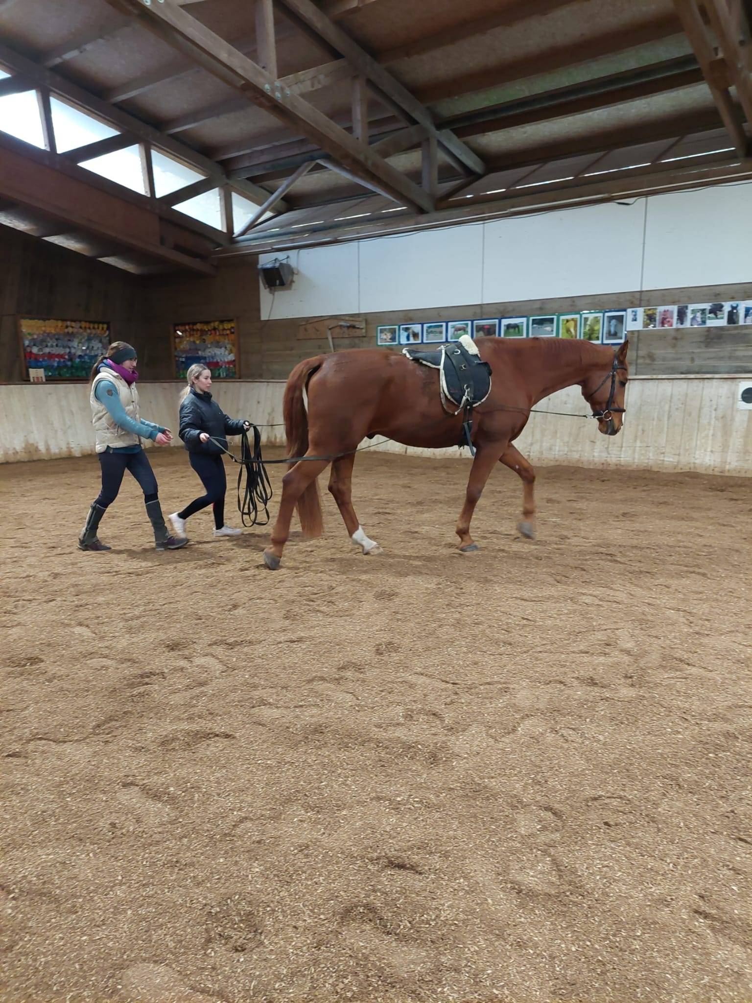 Bevor wir noch intensiver ins Dehnen und auch Massieren der Pferde eintauchten, durfte jede noch einen für alle neuen Teil der Bodenarbeit ausprobieren: die Arbeit am Langzügel bzw. das „Fahren vom Boden“. Was zunächst recht einfach aussieht, stellt sich dann im Tun doch als ziemlich herausfordernd dar: es ist koordinativ nicht so leicht, das Pferd in fleißigem Schritt durch die Halle zu bewegen und dabei genau den Weg zu bestimmen – und sich dabei nicht mit Führzügel oder Doppellonge, Bodenarbeitsgerte und Pferd zu verknoten! Doch Funny erwies sich routiniert als tolle Lehrerin auch für anspruchsvollere Lektionen und Ludwig zeigte sich geduldig und hielt im Zweifel kurz an, bis alles wieder sortiert war.