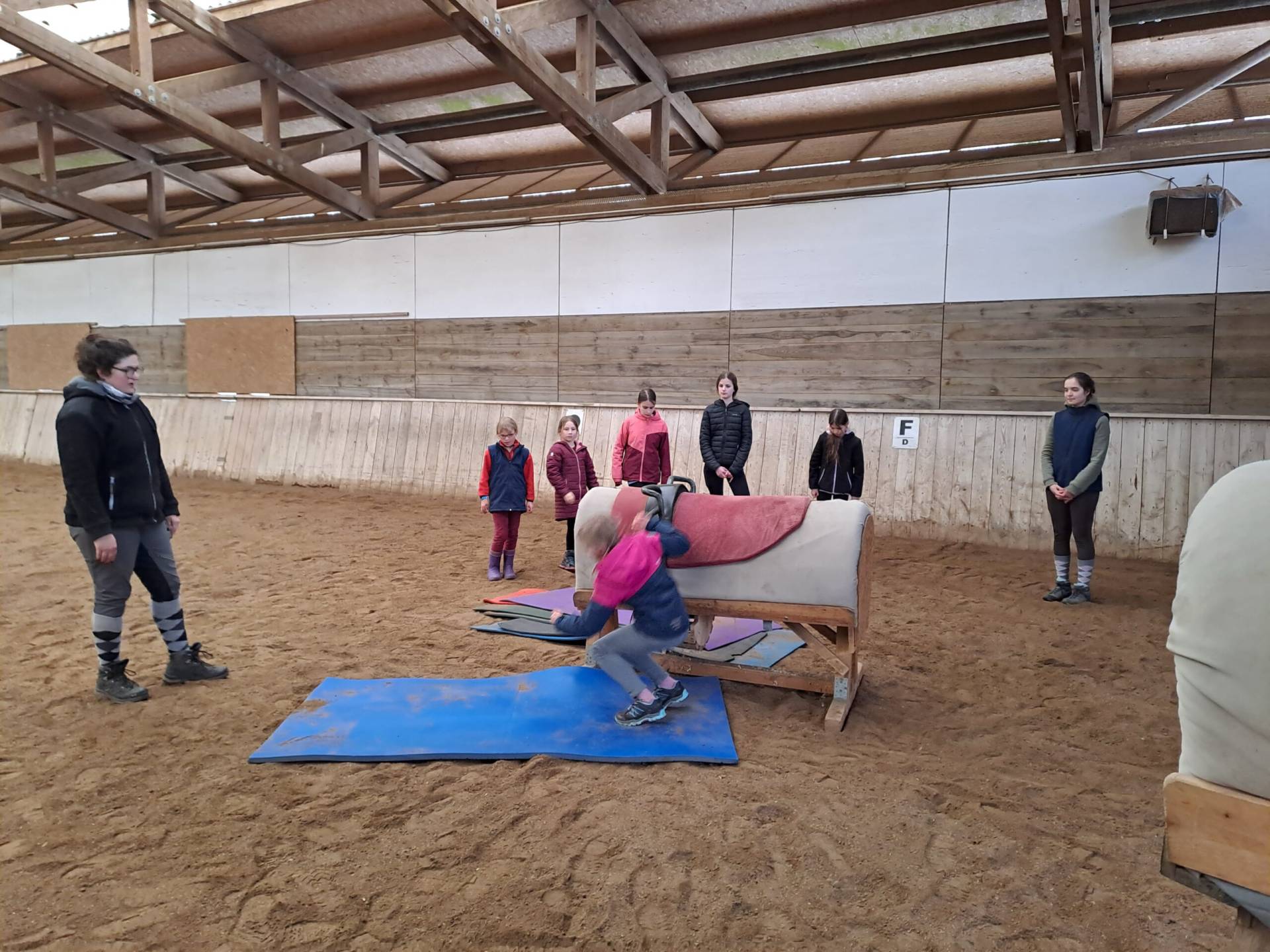 Nach ein paar Kennenlernrunden gingen die Jüngeren, alle aus den beiden Volti-Nachwuchsgruppen, hinüber in die Halle. Dort bauten wir gemeinsam drei Stationen auf: ein Dressurviereck mit richtigen Bahnpunkten, einen Springparcours mit echten Hindernissen und einen „Voltigierzirkel“ mit dem Volti-Fasspferd. Dann trainierten wir die drei Pferdesportdisziplinen, denn abschließend stand nach einer kurzen Pause mit Obst und Keksen zur Stärkung noch ein „Turnier“, wenn auch nur mit gedachtem Pferd, an: die Dressurprüfung war für jede am anspruchsvollsten, denn für manche war diese Disziplin noch ganz unbekannt. Trotzdem schaffte es jede, in der Prüfung eine Aufgabe „durchzureiten“, in der die verschiedenen Grundgangarten an bestimmten Bahnpunkten gewechselt und unterschiedliche Hufschlagfiguren gezeigt werden sollten. Im „Springen“ mussten die Hindernisse in einer festgelegten Reihenfolge überwunden werden, wobei die Zeit gestoppt wurde. Los ging es im „Trab“ über ein Kreuz, danach ging es im „Galopp“ weiter über Cavaletti, einen Steilsprung und eine Kombination aus Steilsprung und Oxer. Die letzte Disziplin bei unserem Turnier war das Voltigieren – für unsere Nachwuchsvoltis quasi ein Heimspiel.