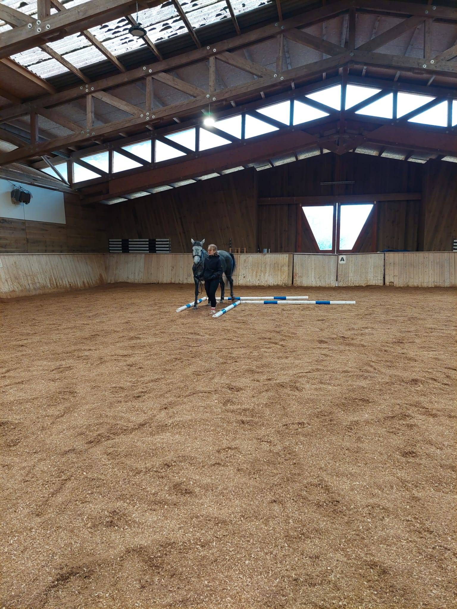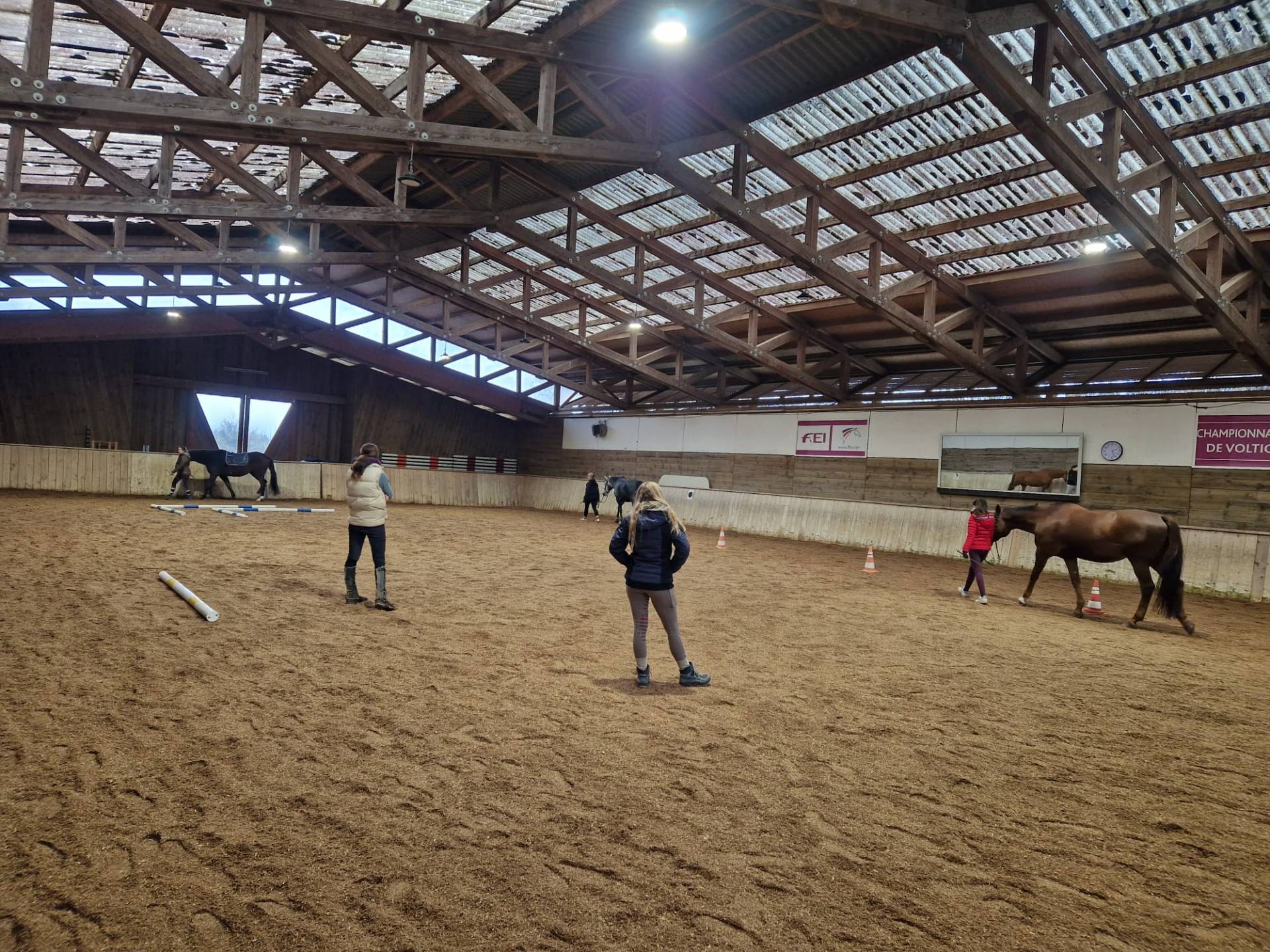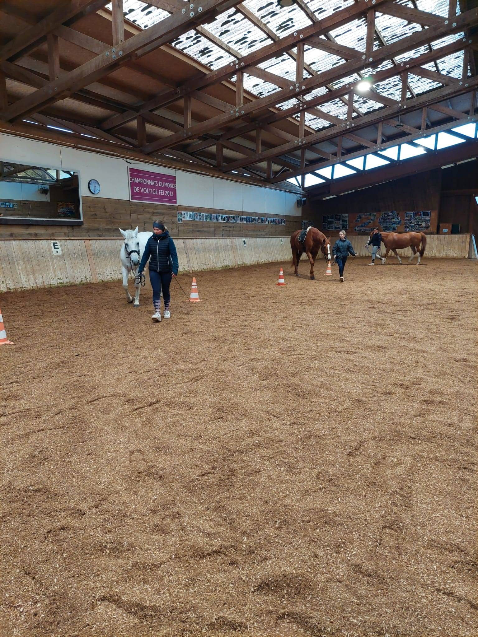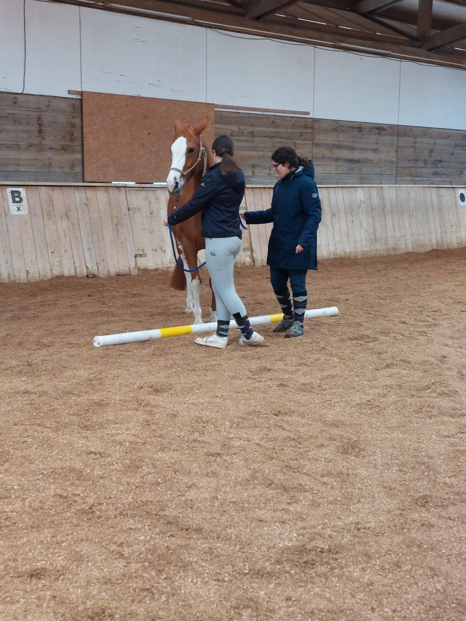 Los ging es mit einem kurzen Brainstorming zum Thema, was Bodenarbeit überhaupt ist und wofür es gut ist. „Führen durch Hindernisse“, „seitwärts an der Hand“, „Longieren“, „Bodenarbeit ist Beziehungsarbeit“ waren Gedanken, welche die Teilnehmerinnen im Kopf hatten. An diesem Nachmittag konzentrierten wir uns zunächst auf das Führen der Pferde, wobei wir hier auf die richtige Führposition achteten und das Halten, Anlaufen sowie das Rückwärts- und Seitwärtsweisen über Bodenhindernisse übten: Slalom, Stangen, Stangen-L und Cavaletti waren vorwärts, seitwärts und rückwärts zu überwinden. Die Pferde verstanden die Aufgaben schnell und ihre Aufmerksamkeit wuchs; die Hilfengebung der Führerinnen wurde immer klarer und ihre Körpersprache selbstbewusster und verständlicher.